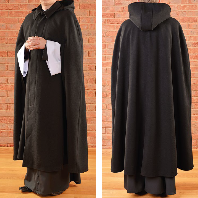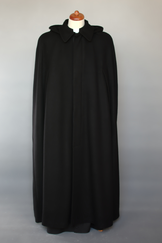 Capa clerical com capuz removível, feito de material de lã. Possui aberturas para as mãos e é presa com um gancho e botões ocultos (feita por medida).