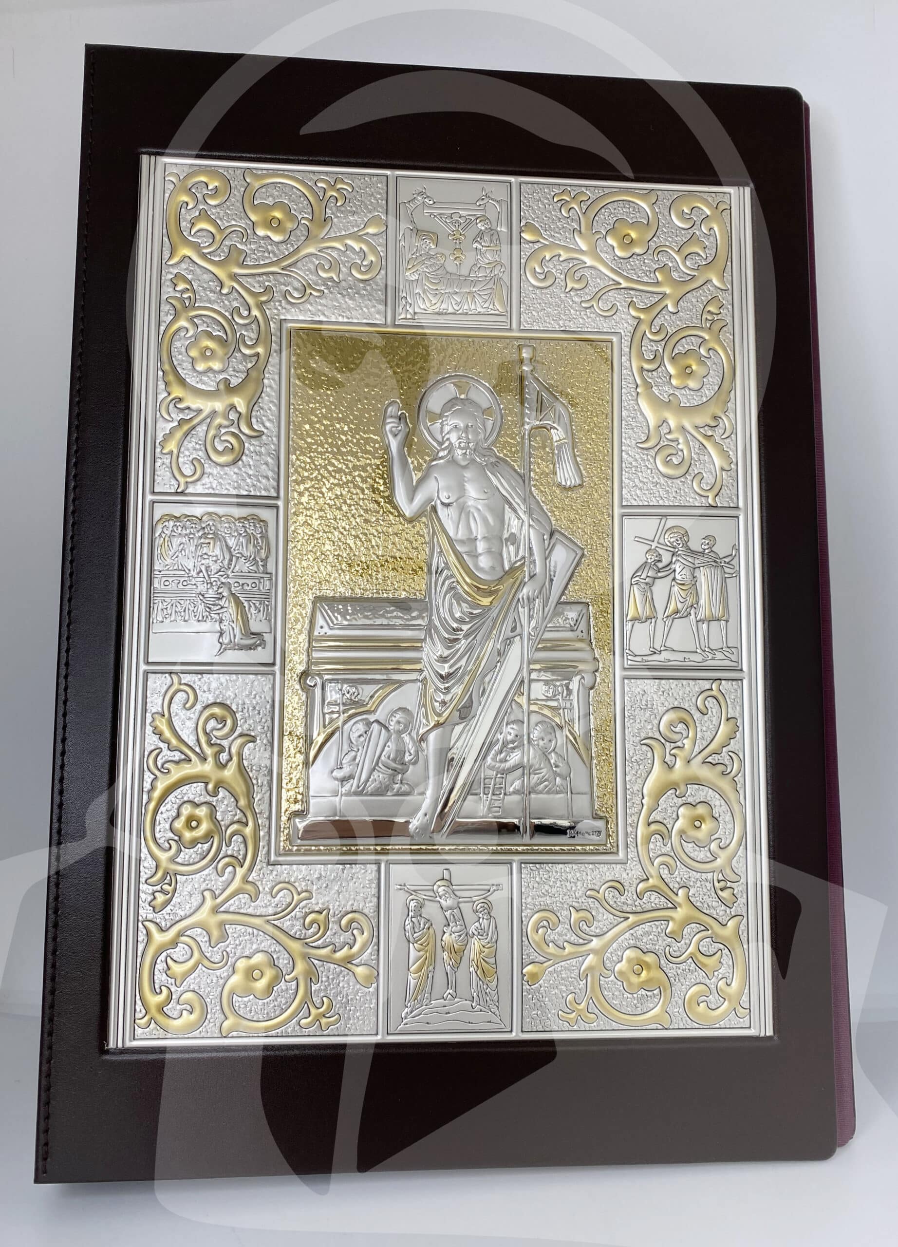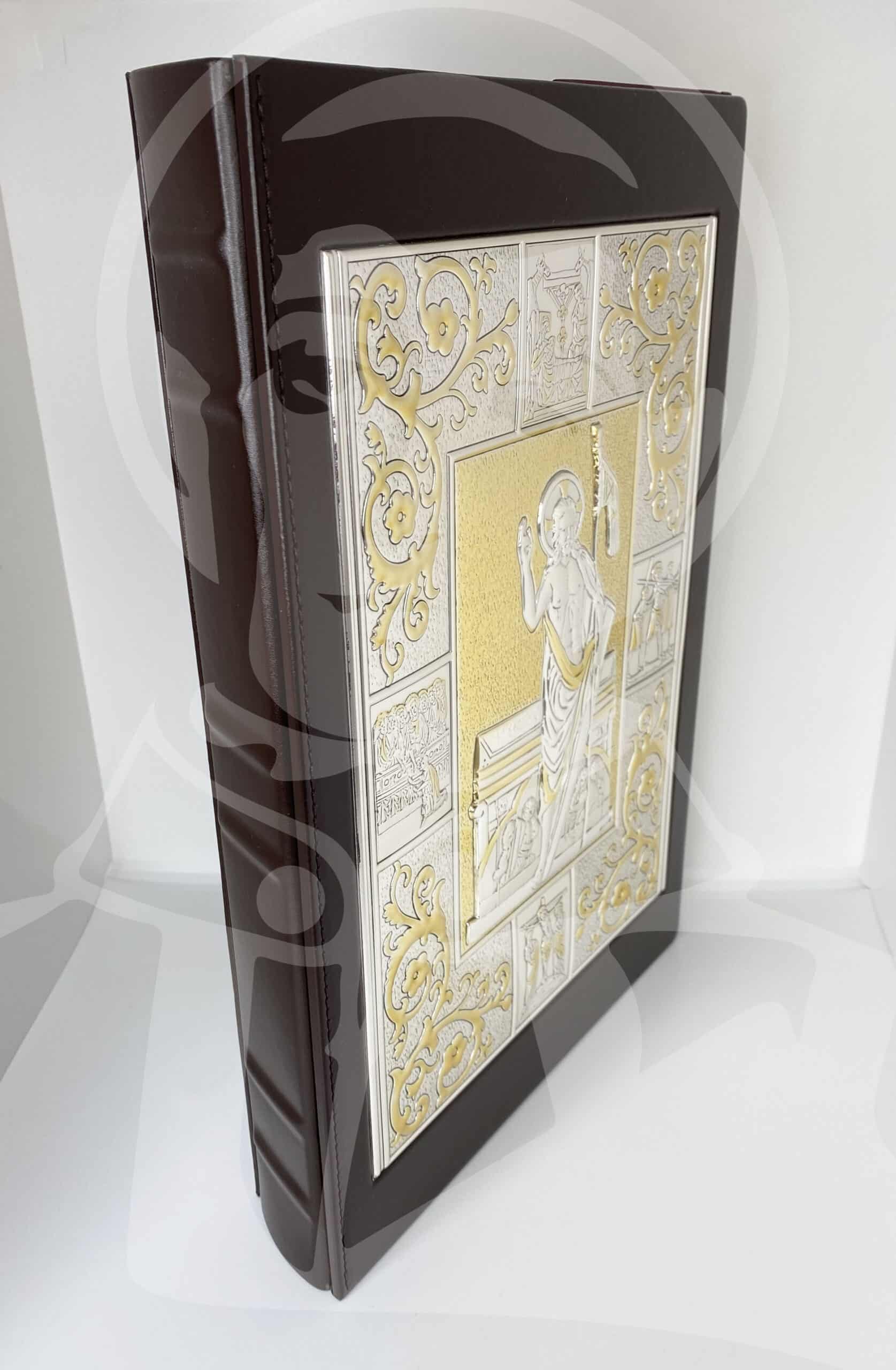Capa para Evangeliário castanha em pele com bilaminado de prata 925 – 1 lado