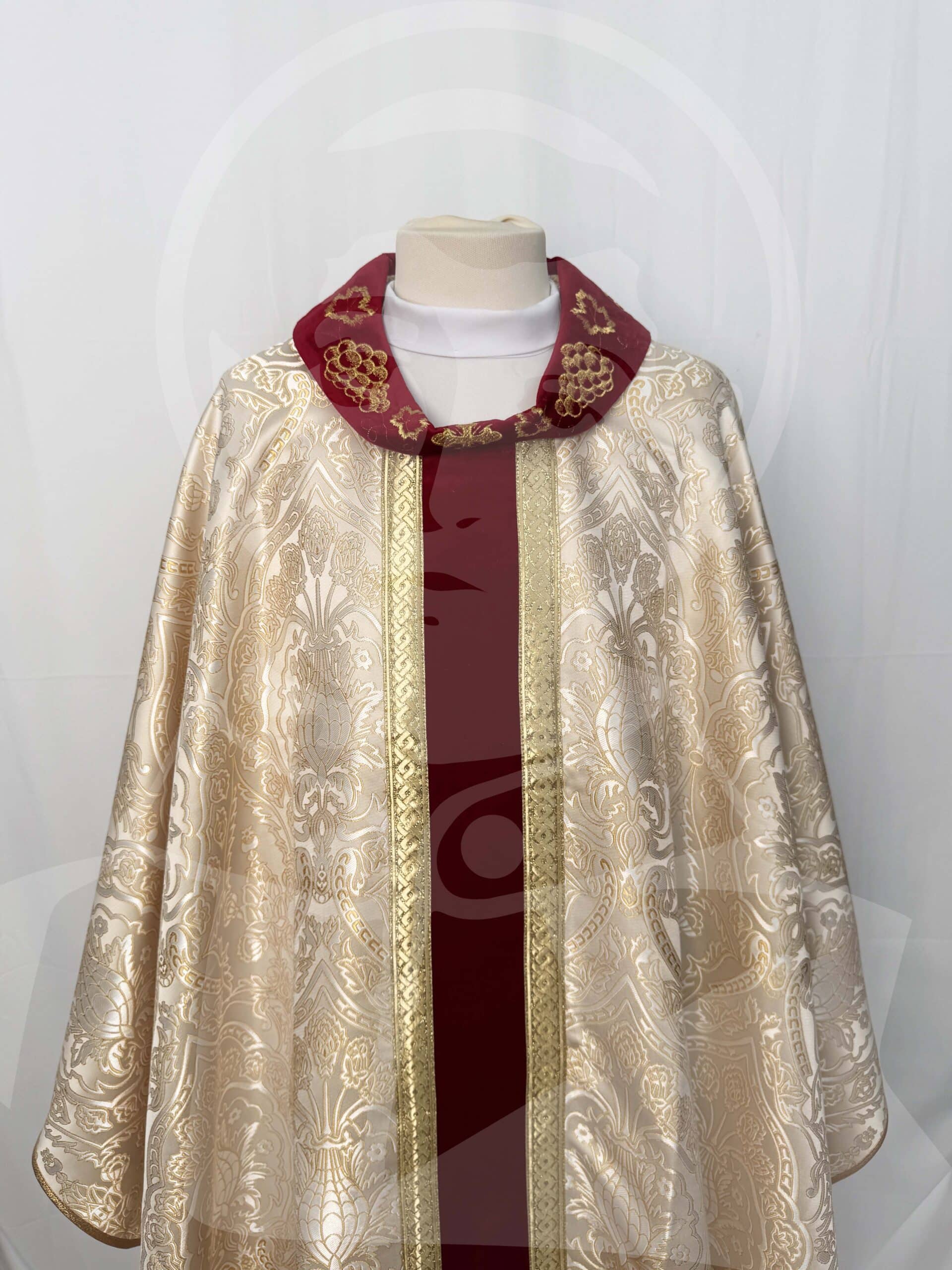 Casula Dourada com Estola tecido damasco com Estolão de veludo bordô com aplicação de galão dourado