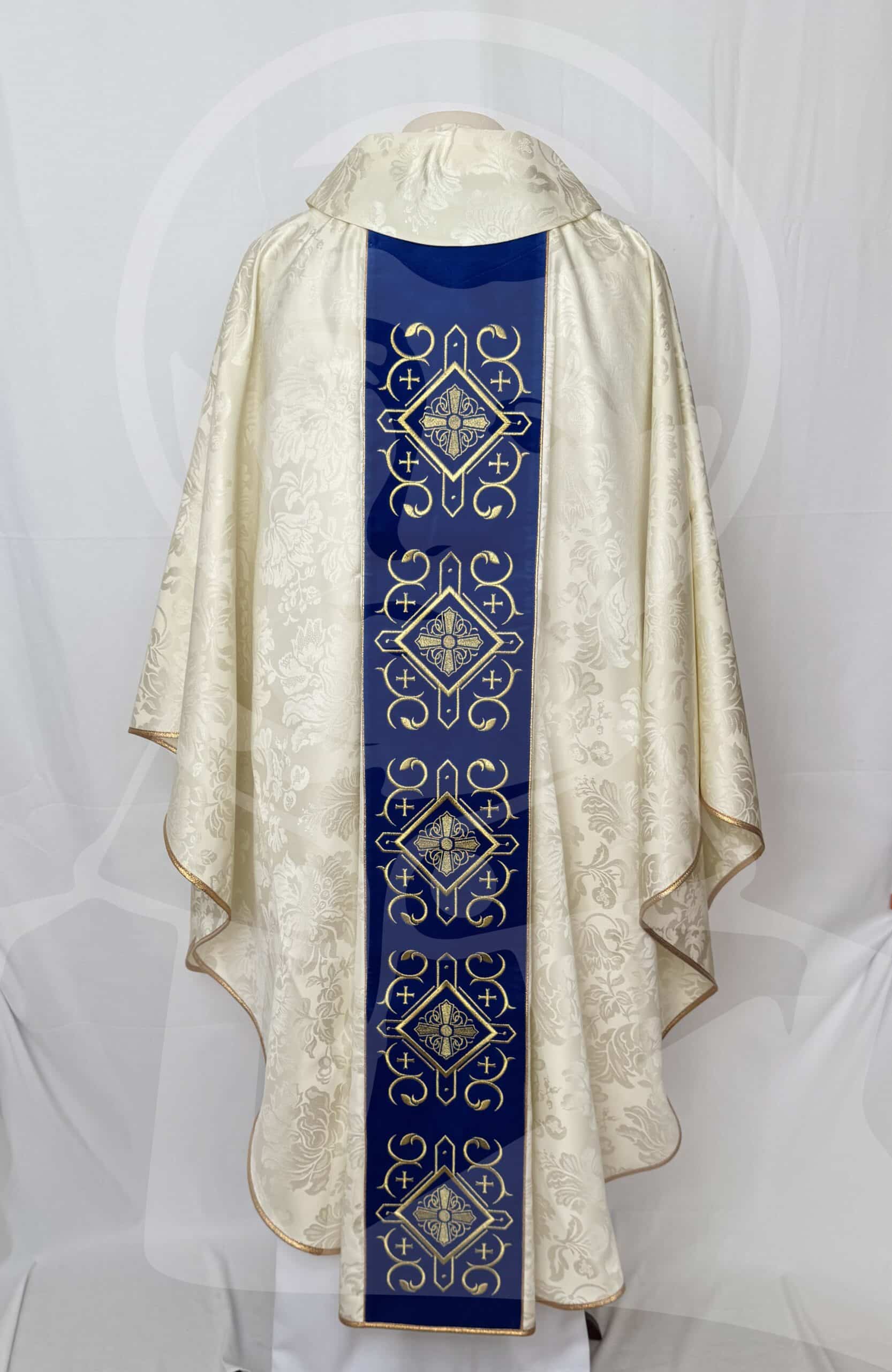 Casula Mariana com Estola em tecido damasco com Estolão de veludo azul bordado