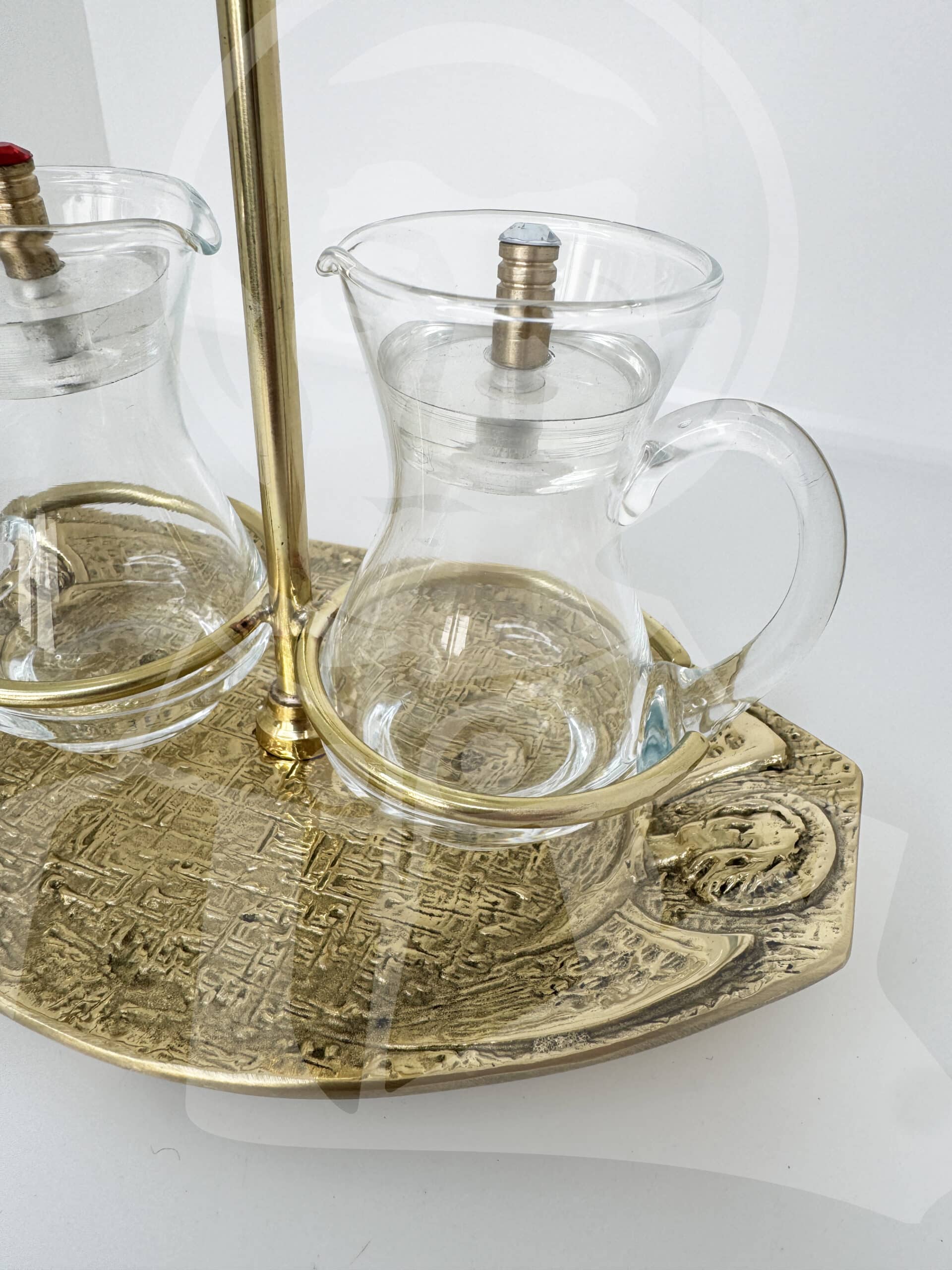 Conjunto de galhetas com prato fundido dourado e tampas de acrílico