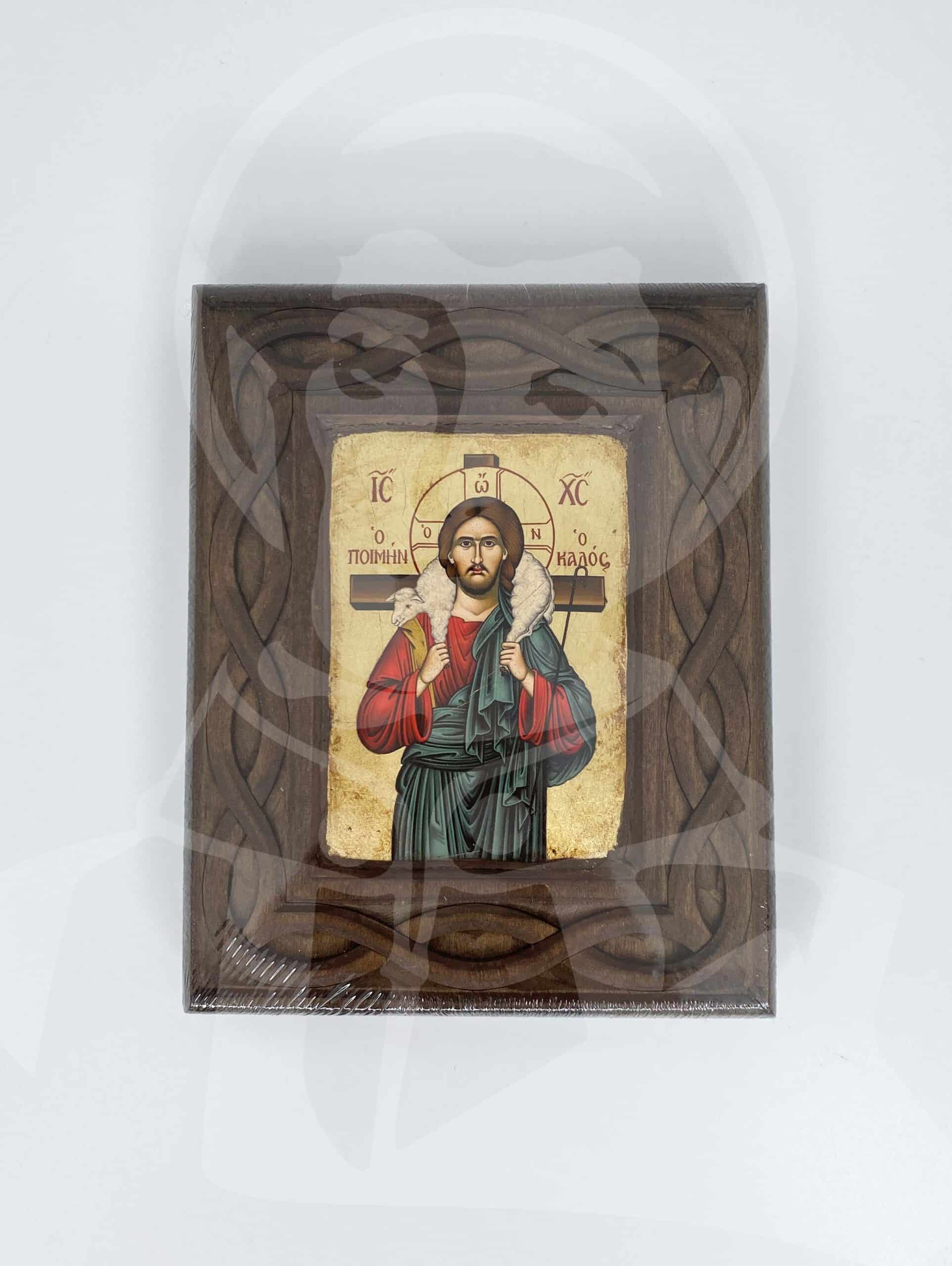 Ícone Bom Pastor com moldura em madeira esculpida com folha de ouro