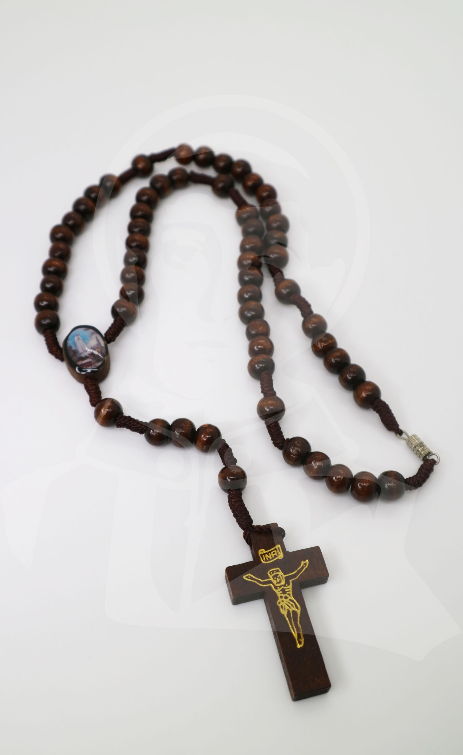 Terço de madeira castanho com cordão e fecho de metal