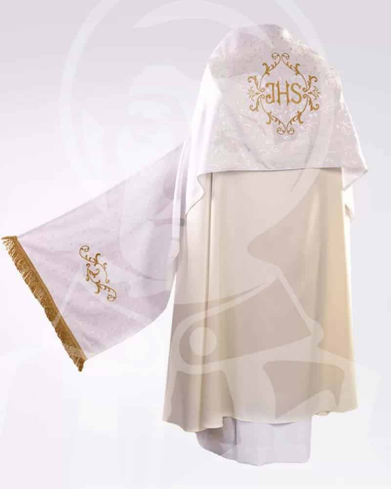 Véu de Ombros Branco em tecido damasco com bordado JHS
